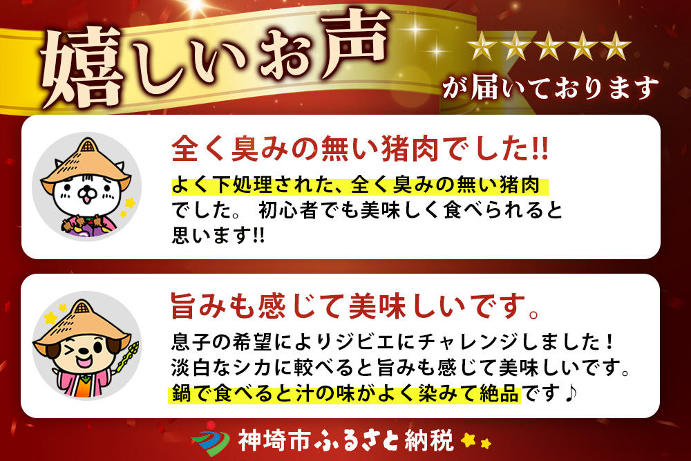 また、「猪は脂を食べる」と言われるほど、猪肉の脂は旨味があり、あっさりしてしつこくないのが特徴です。臭みの少ない猪肉をぜひお楽しみください。