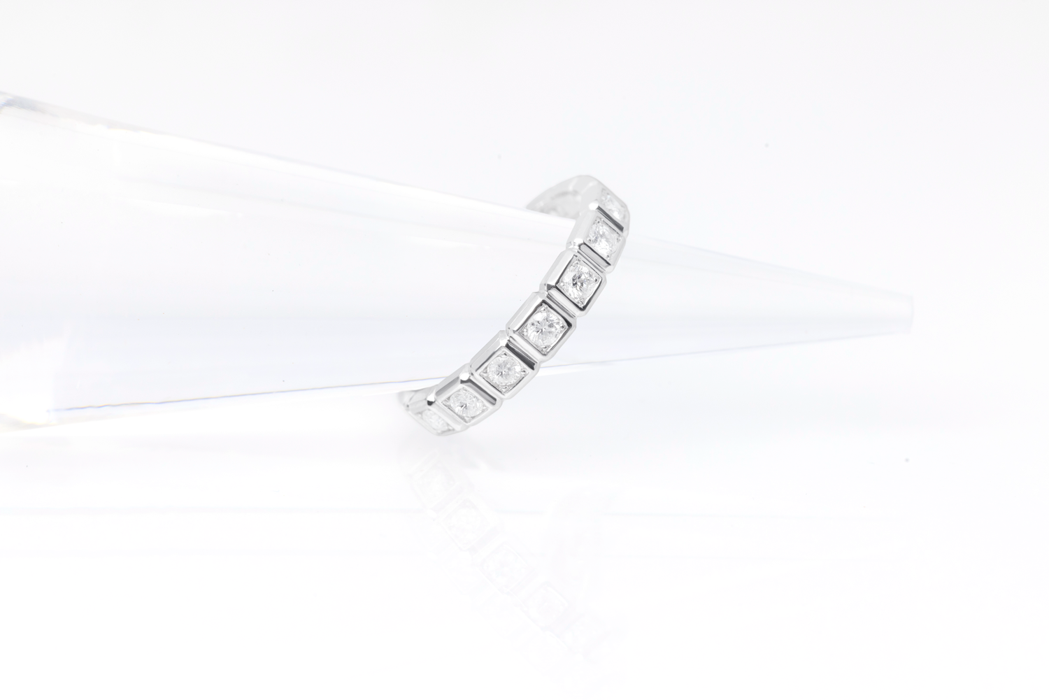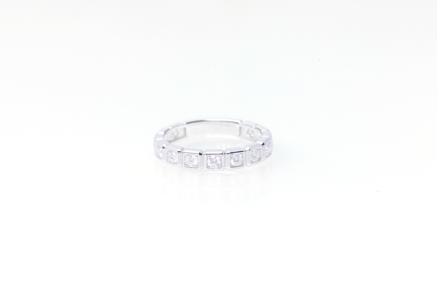 ひとつひとつのダイヤモンドを丁寧にスクエア型の枠に収めた、モダンで洗練されたリング。
