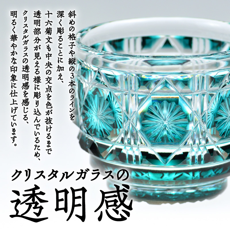 薩摩切子は透明なガラスに色ガラスを1〜5mm位に厚く被せ、カット(切子)をすることにより、色ガラスの厚さの変化によってグラデーションを施した色被せカットグラスです。