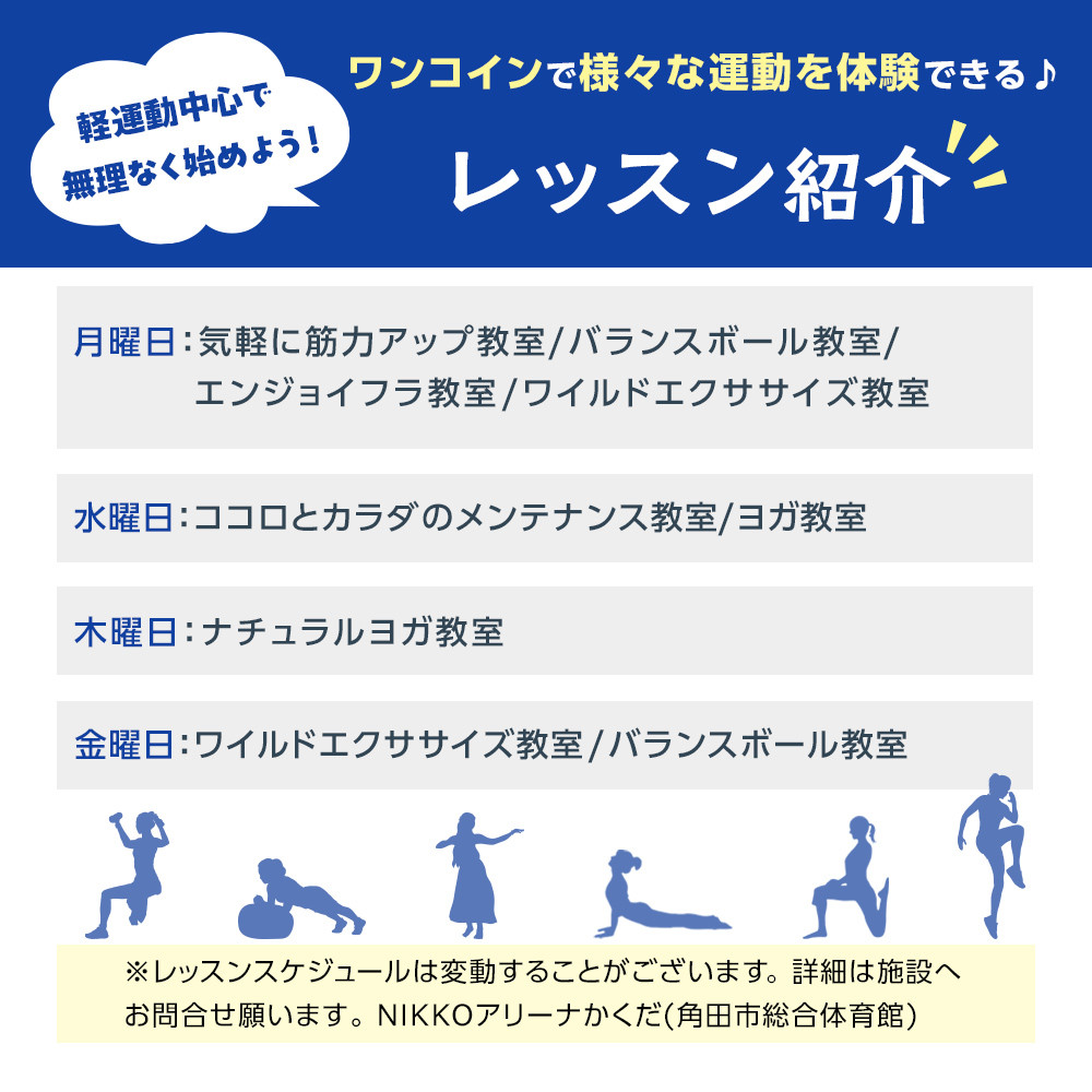 ワンコインで参加できる各種レッスンに1回ずつ支払うことなくご利用いただけます。