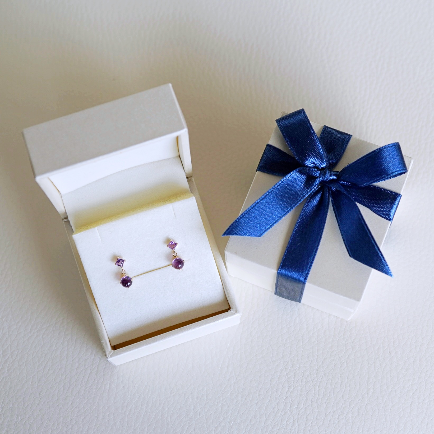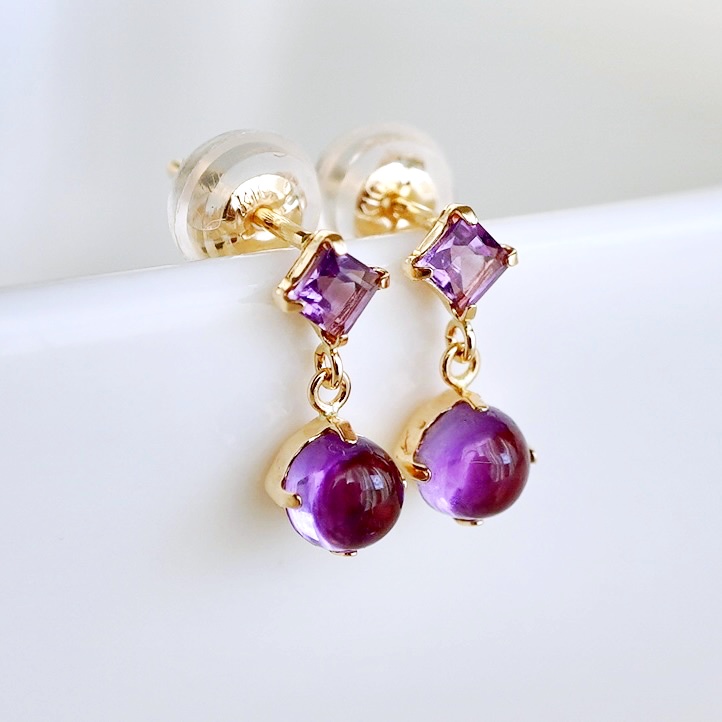 上は正方形のスタイリッシュな印象のスクエアカット、下はぷっくりと可愛らしい透明感が魅力的なカボションカットが留まっております。