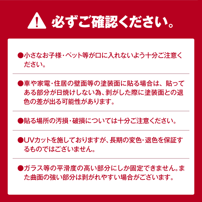 ※車や家電・住居の壁面等の塗装面に貼る場合は、貼ってある部分が日焼けしない為、剥がした際に塗装面との退色の差が出る可能性があります。