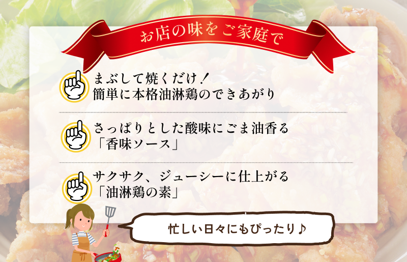 さっぱりとした酸味にごま油が香る「香味ソース」と、サクサク・ジューシーに仕上がる「油淋鶏の素」のセットで、ボリュームのある油淋鶏が作れます。
