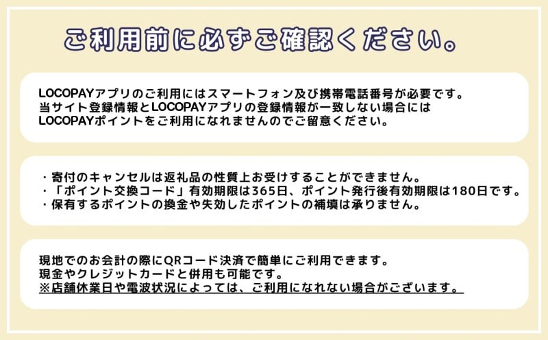 ・ご利用可能店舗では、LOCOPAYポイントの利用を約束するものでなく、事業者の休日等でご利用いただけない場合があります。事業者にお問い合わせすることをおすすめしています。