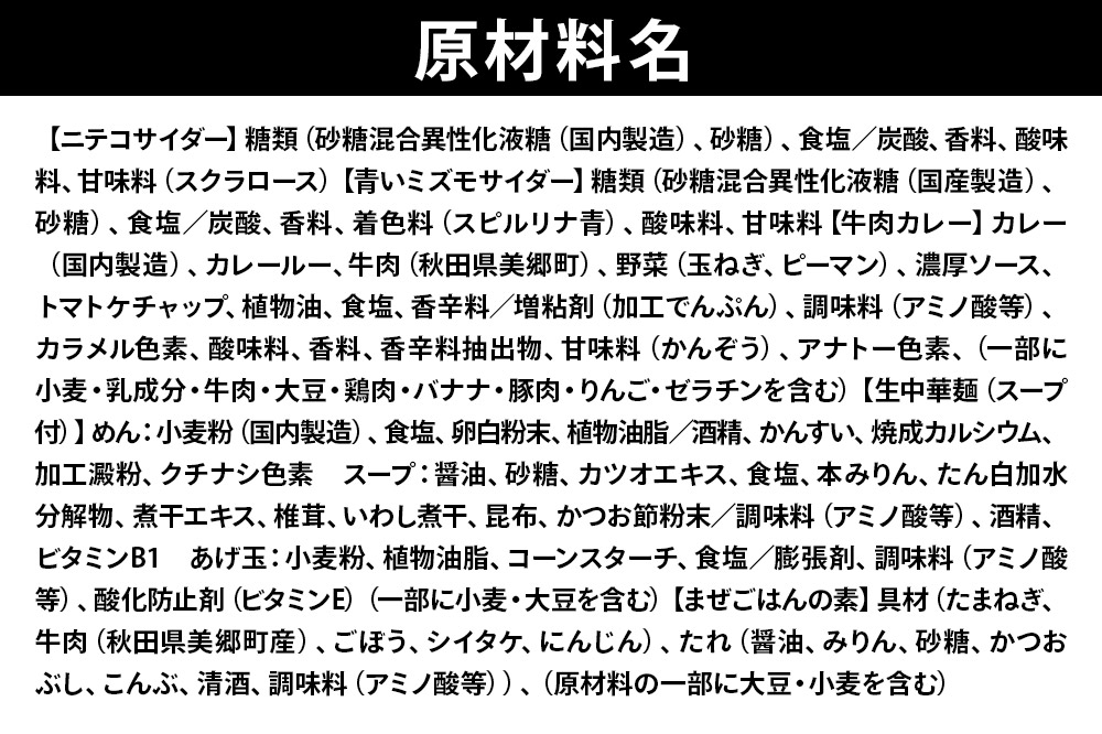 ■賞味期限:サイダー・牛肉カレー・まぜごはんの素:製造日から12ヶ月、生中華麺(スープ付):製造日から3ヶ月