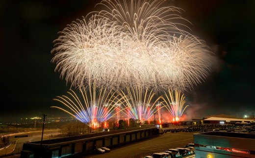 本イベントの最大の見どころのひとつが、「2尺玉」の打ち揚げです。直径約60cmの玉から生まれる大輪は、上空約500mで開花すると直径約480mに広がり、夜空を一瞬で覆い尽くします。首都圏都市部では1尺玉でさえ打ち揚げ可能な花火大会が非常に限られていますが、1尺玉(10号玉)は打揚高度330m、開花時直径320mですので、2尺玉の迫力が凄まじいものだということがイメージできるかと思います。2尺玉は、広大な打ち揚げ場所、安全を確保できる環境、そして高度な技術を持つ花火師など、いくつもの条件が揃わなければ実現できません。国内でも実際に目にする機会は極めて限られており、まさに“奇跡の大輪”と呼ぶにふさわしい花火です。また、広大な敷地に広がる富士スピードウェイのサーキットを舞台としワイド約1.5kmの打ち揚げを実施いたします。