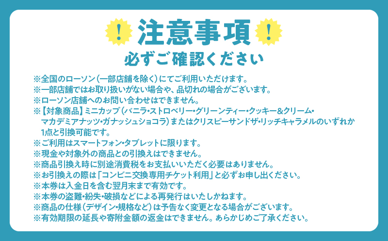 ※【対象商品】ミニカップ(バニラ・ストロベリー・グリーンティー・クッキー&クリーム・マカデミアナッツ・ガナッシュショコラ)またはクリスピーサンド ザ・リッチキャラメルのいずれか7点と引換可能です。