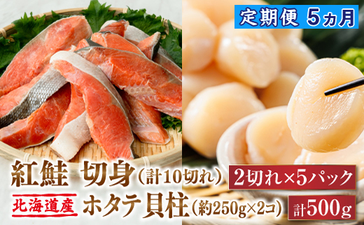 【定期便 5ケ月連続】 紅鮭 切身 計10切れ <2切れ ×5パック> 半身 1kg以上 と 北海道産 ホタテ貝柱 約250g×2コ(合計500g) のセット便 魚のプロの極切り 個包装 小分け ロシア産 鮭 切り身 厚切り サケ 冷凍 甘塩 魚 帆立 貝柱 刺身 産地直送 定期便 魚介類 海鮮 一人暮らし セット おかず 絶品 人気 ヒロセ 北海道 釧路町 釧路超 特産品 -[121-1262-168-022]