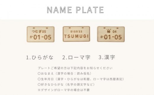 ネームプレートには「1.生年月日、2.お子様のお名前、3.好きなひらがな一文字(名字の頭文字など)」が印字できます。お申込み時、備考欄にご希望の内容を記入してください。