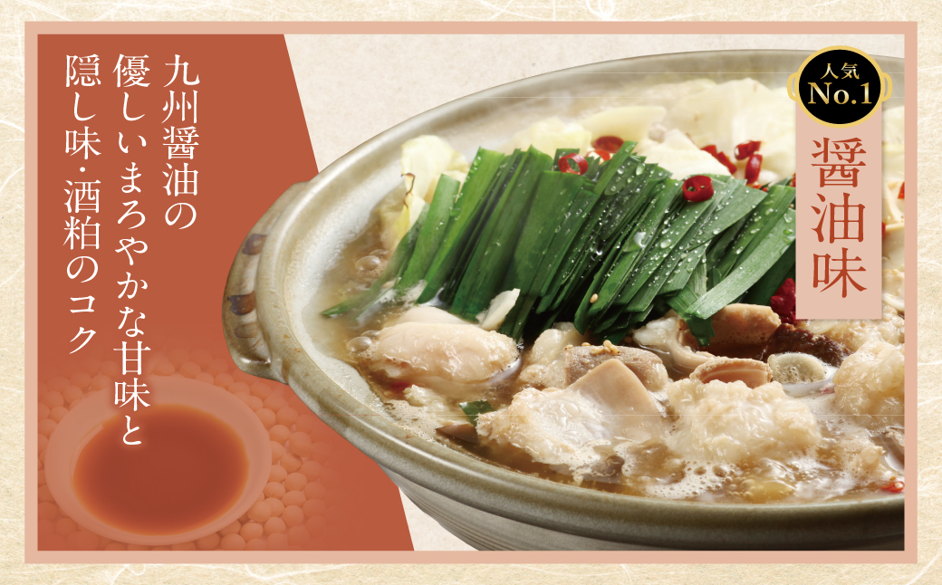 ・濃縮もつ鍋スープ:醤油(福岡県製造)、清酒粕、みりん風調味料、鰹節エキス、昆布エキス、にんにく、酵母エキス/調味料(アミノ酸等)、カラメル色素、甘味料(甘草、ステビア)、酸味料、(一部に小麦・大豆を含む)