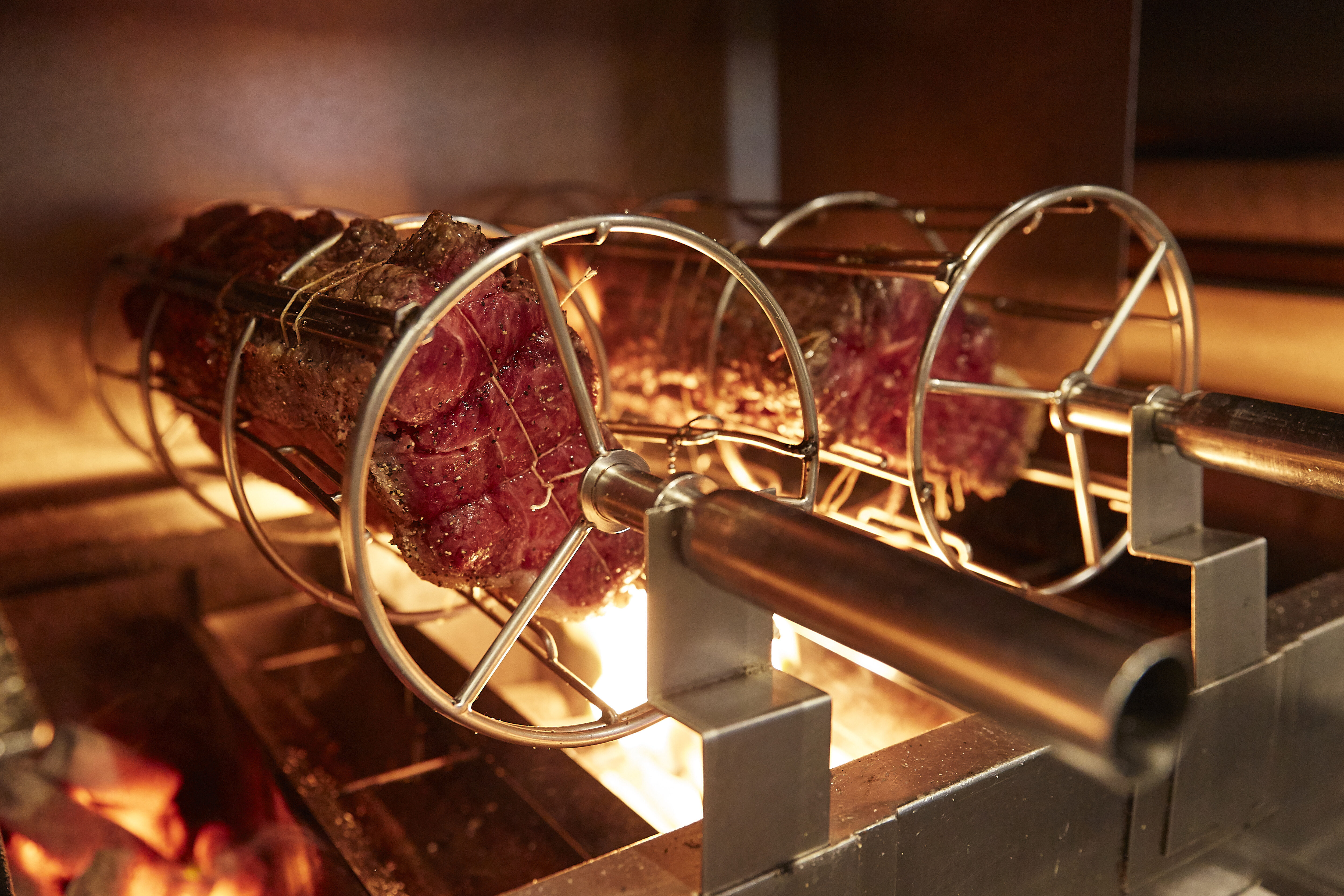 専用ロースターを用い炭火のみで500℃〜1000℃の火力を調整しながらサーロインの塊肉1本1本を約2時間かけてシェフが熟練の技術で焼き上げます。