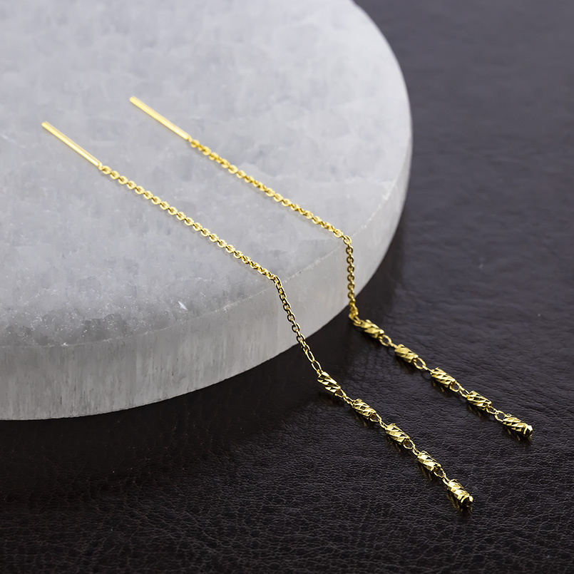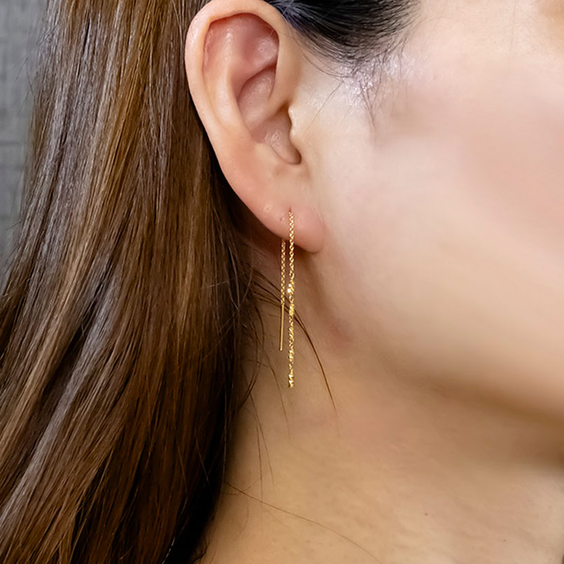 動きに合わせてカット面が光を反射し純金ならではの上品な輝きを楽しめるアメリカンピアス