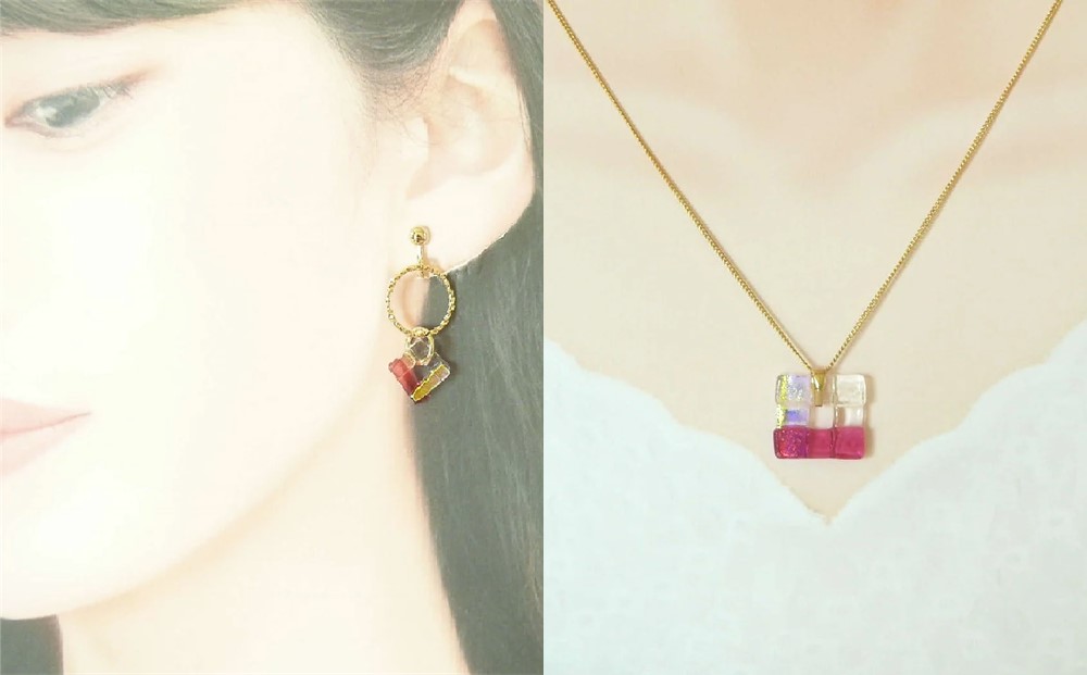 ローズピンクを基調にしたアクセサリーは、大人の可愛らしさで好感度が高く、シンプルな装いのアクセントとして目を惹きます。