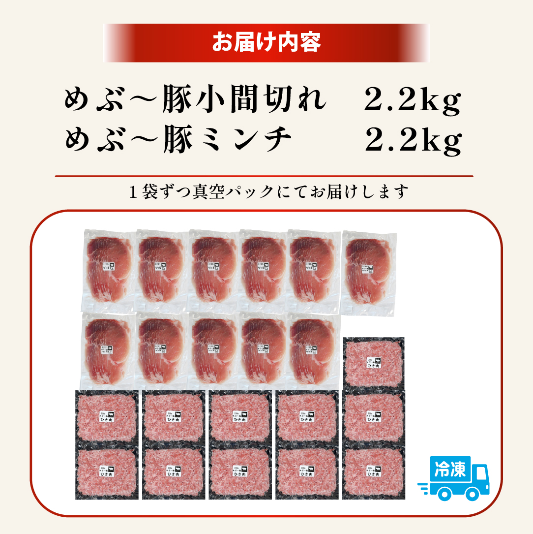 宮崎県小林市の豊かな自然の恵みをいっぱいに受けて育った小林市産 "めぶ~豚" を、様々な用途でお使いいただける小間切れとミンチをセットにしてお届けします。
