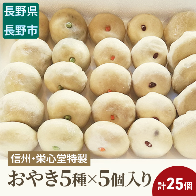 おやき25個(野沢菜・丸なす・野菜ミックス・切り干し大根・つぶあん×各5個)