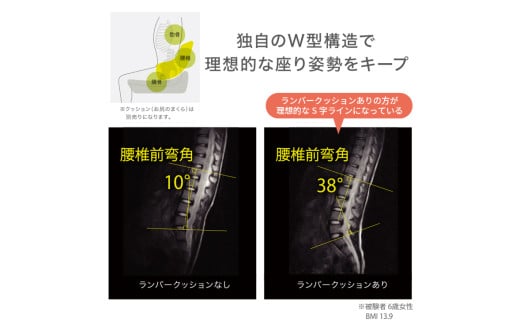 ■W型に設計されたクッションが腰椎と腸骨と肋骨の3点をやさしくホールドすることで理想的なS字ラインの座り姿勢を自然と保つことができます。