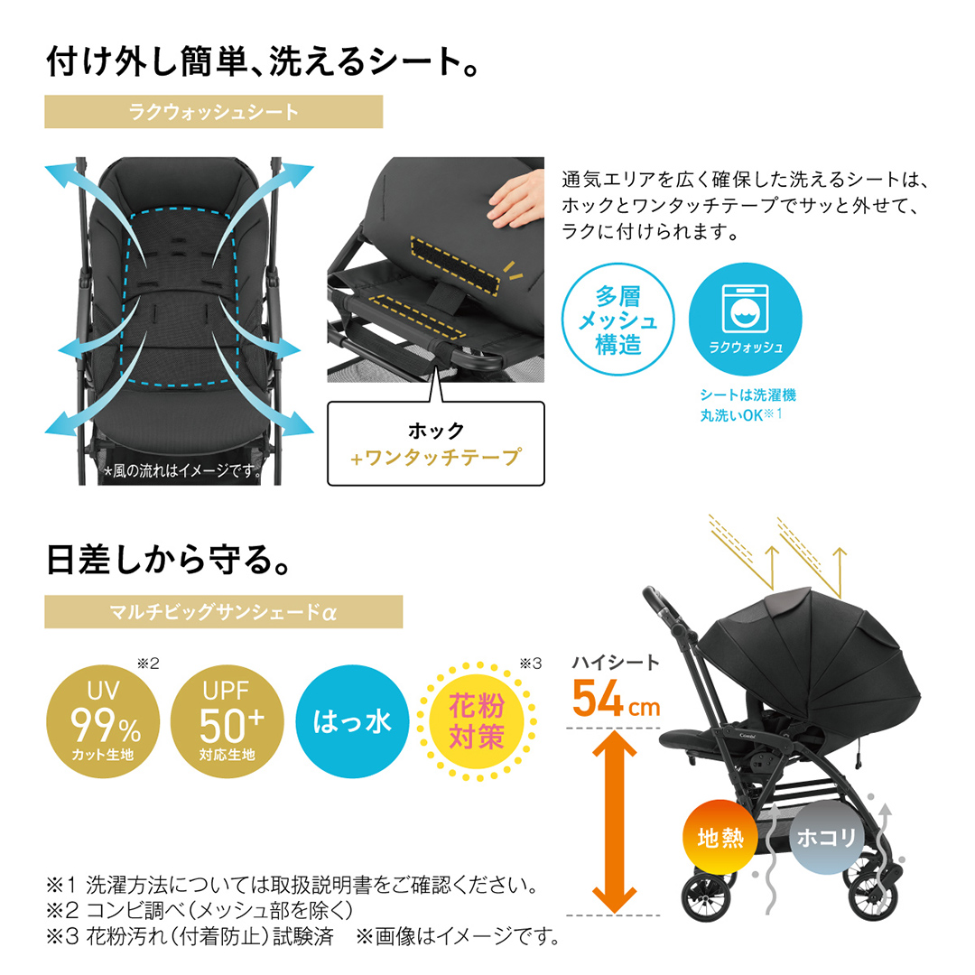 UV99%カット(コンビ調べ)、UPF50+、はっ水、花粉(付着防止)試験済み