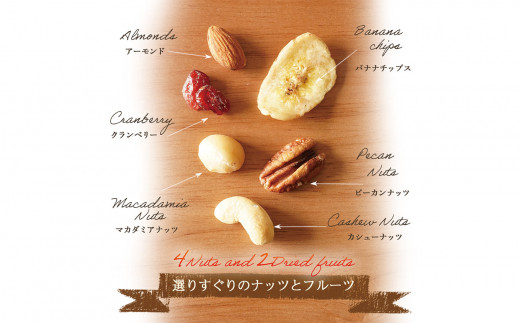 絶妙なバランスでミックスされたナッツが4種類、ハイクオリティなドライフルーツ2種のミックスナッツです。