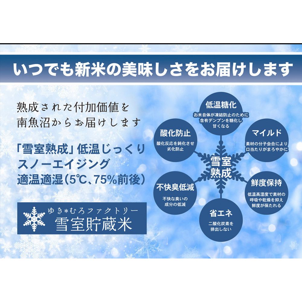 さらに「お米が劣化しにくい」とされる室温5℃、湿度75%で保たれた「雪室貯蔵庫」で保存することにより「いつでも新米と変わらぬ鮮度とおいしさ」をお届けいたします。