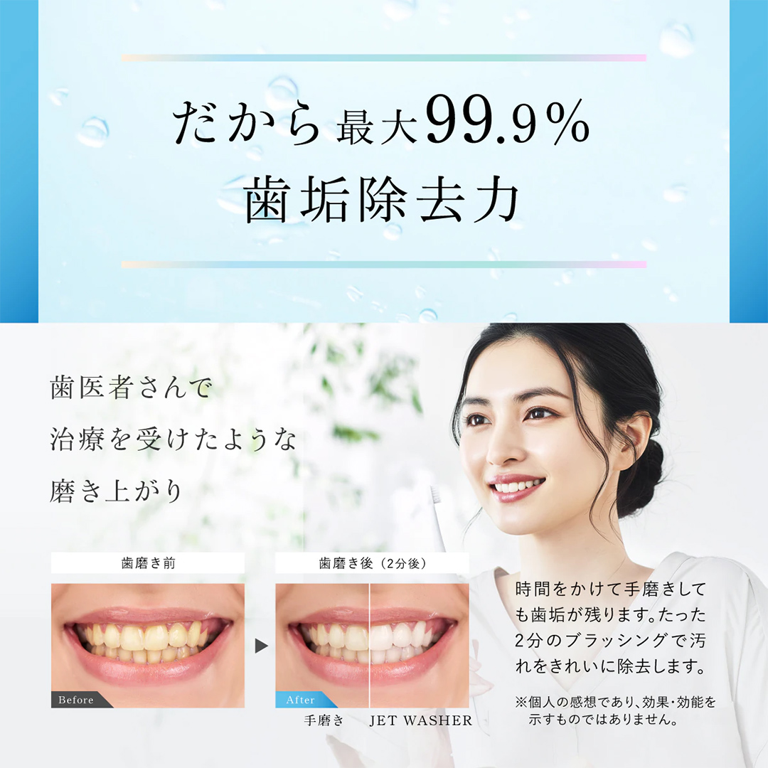 JET WASHERは、振動によるブラッシングと水圧による‘フロス’を同時に行える、高性能でありながら、時間短縮も叶える次世代電動歯ブラシ。