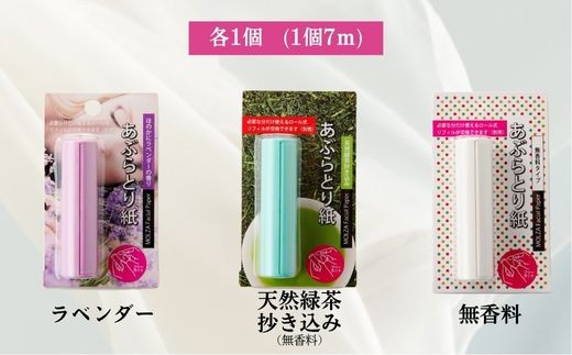 1.ほのかな4つの香り「ローズ・ラベンダー・柑橘系・せっけん」、天然緑茶漉き込み、無香料タイプのあぶらとり紙6種類を詰め合わせました。