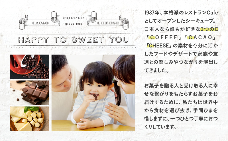 シーキューブ自慢のチーズ・カカオ・コーヒーのお菓子と、季節のお菓子を組み合わせたアソートです。