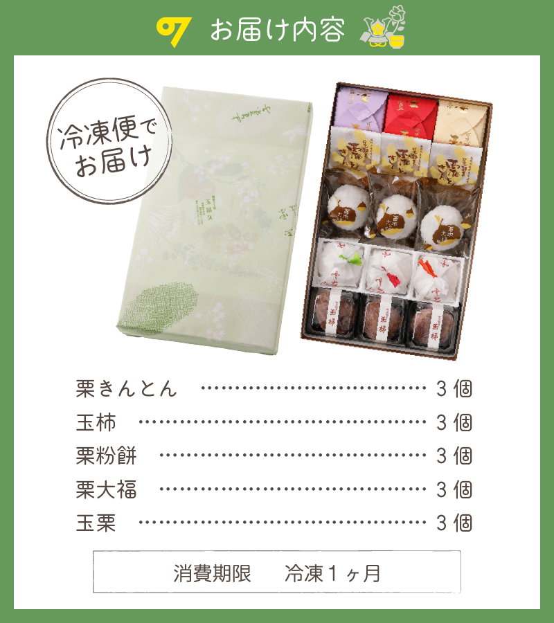 15個(栗きんとん:3個/玉柿:3個/栗粉餅:3個/栗大福:3個/玉栗:3個)