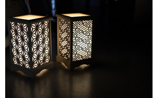 彫木行燈は、レーザー彫木加工と従来の建具製作技術を組み合わせ、組子細工の風合いを損なうことなく、安価での提供を可能にした行燈です。基本的デザインは、伝統的組子細工柄を用いていますが、レーザー彫木加工により様々なデザインの製品が製作可能となっています。