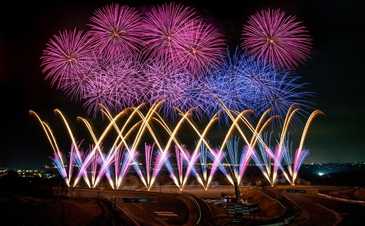 本イベントの最大の見どころのひとつが、「2尺玉」の打ち揚げです。直径約60cmの玉から生まれる大輪は、上空約500mで開花すると直径約480mに広がり、夜空を一瞬で覆い尽くします。首都圏都市部では1尺玉でさえ打ち揚げ可能な花火大会が非常に限られていますが、1尺玉(10号玉)は打揚高度330m、開花時直径320mですので、2尺玉の迫力が凄まじいものだということがイメージできるかと思います。2尺玉は、広大な打ち揚げ場所、安全を確保できる環境、そして高度な技術を持つ花火師など、いくつもの条件が揃わなければ実現できません。国内でも実際に目にする機会は極めて限られており、まさに“奇跡の大輪”と呼ぶにふさわしい花火です。また、広大な敷地に広がる富士スピードウェイのサーキットを舞台としワイド約1.5kmの打ち揚げを実施いたします。