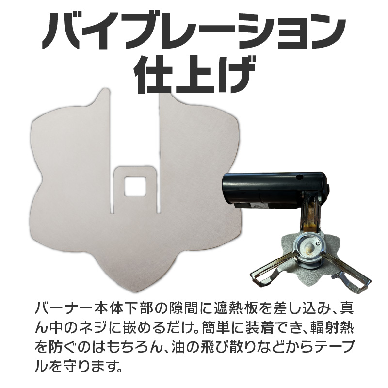 バーナー本体下部の隙間に遮熱板を差し込み、真ん中のネジに嵌めるだけ。簡単に装着でき、輻射熱を防ぐのはもちろん、油の飛び散りなどからテーブルを守ります。