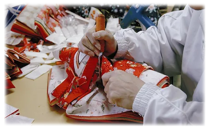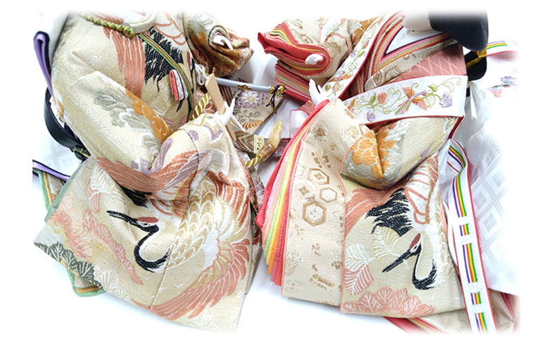 ひな人形にしてみたい着物・帯地をお送り又はご持参いただければ、担当スタッフとの打ち合わせの上人形の着物に仕立て上げます。
