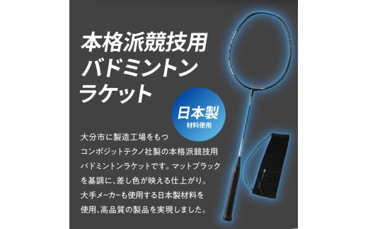 日本製のカーボンプリプレグを使用し、大分市の生産工場にて製造された「Made in Japan」「Made in 大分」の競技用バドミントンラケット。