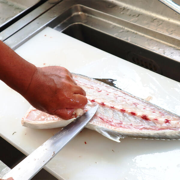 海上で素早く血抜きなどを行い、浜にある自社加工場で素早く真空加工することにより鮮度を保つことができ、上質な肉質の魚をお届けいたします。