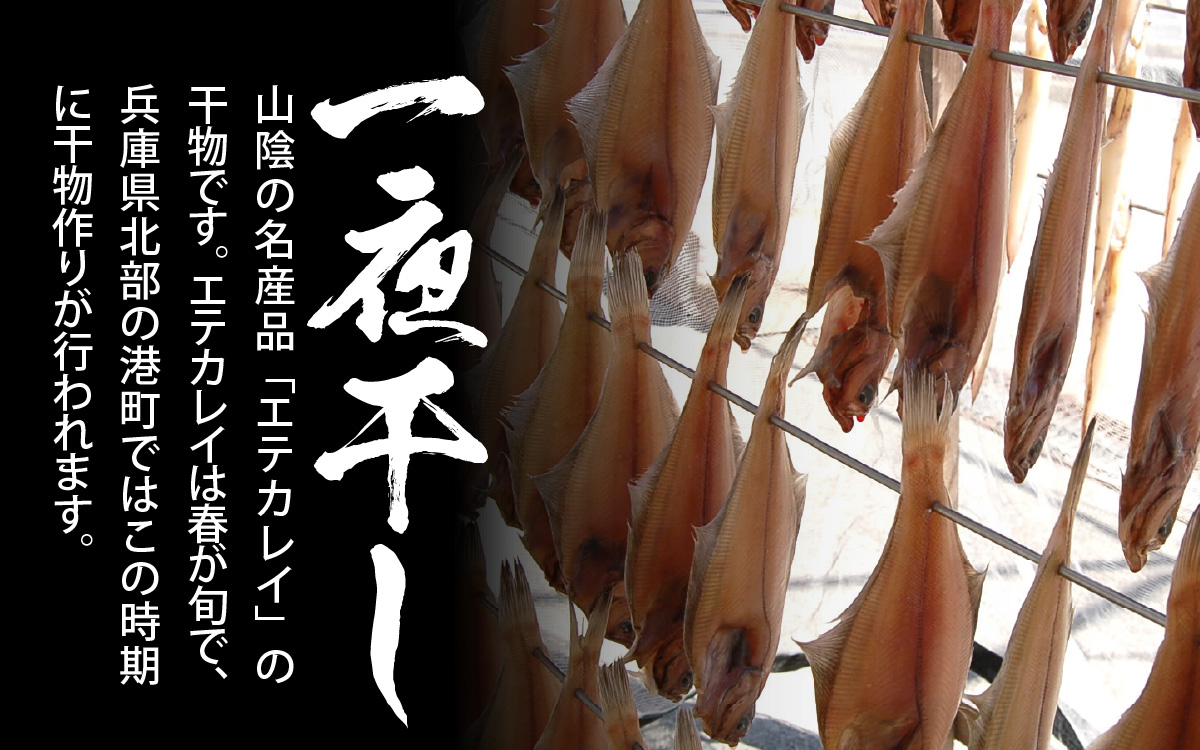 山陰の名産品「エテカレイ」の干物です。エテカレイは春が旬で、兵庫県北部の港町ではこの時期に干物作りが行われます。旬干しは脂があり、身がふっくらとしており、北部の港町では昔から一番食している定番の干物がこの「エテカレイ一夜干し」です。お店によって塩梅が異なりますので、一概に「エテカレイ一夜干し」と言っても店それぞれで味わいが異なります。