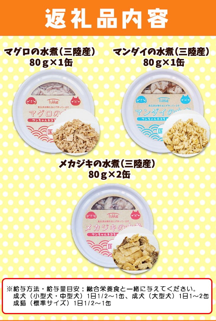 三陸水揚げのお魚を中心に使用し、食品添加物を加えず水のみで作った素材缶詰です。大切なネコちゃんワンちゃんにはもちろんですが、食事の塩分が気になる方や、離乳食としても安心してお召し上がりいただけます。