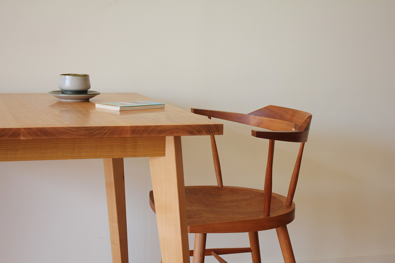 一日に何度も出したり引いたりするダイニングチェアとして使える椅子にしたいと思いデザインしたので、見た目のすっきりした印象通り、木製椅子ながら、軽く仕上がっています。
