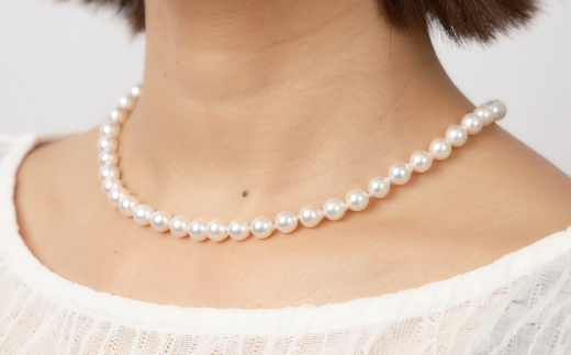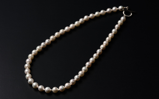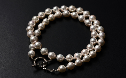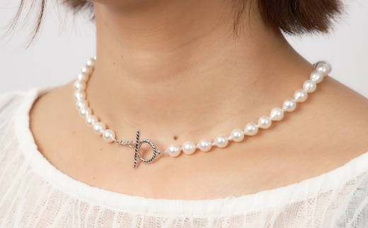 セミラウンド・セミバロックのアコヤ真珠は比較的気軽に本物の艶やかな真珠を楽しむことができ、抜けにくい工夫をこらした黒くなりにくいお洒落なシルバーマンテルとの組み合わせで、エレガント且つ大人カジュアルにご利用いただける素敵なネックレスです。