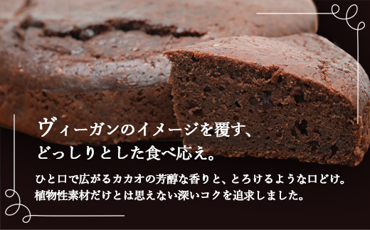 卵・乳製品・白砂糖といった動物性原料を一切使用しない、完全植物性のガトーショコラです。「ヴィーガンは物足りない」という常識を覆す、濃厚なカカオの香りと、しっとりどっしりとした食べ応えを実現しました。豆乳や菜種油で滑らかさを出し、きび砂糖の優しい甘さで仕上げた、罪悪感なく心も体も満たされる一品です。