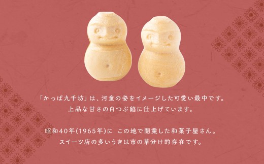 あけぼの河童菓庵人気の「かっぱ九千坊」は、河童の姿をイメージした可愛い最中です。
