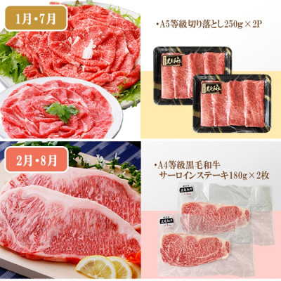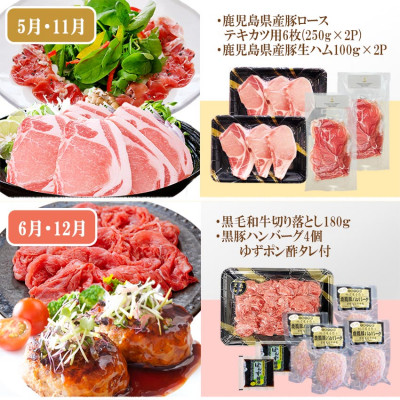 鹿児島県産黒毛和牛と黒豚を半年間(月1回)お楽しみください。