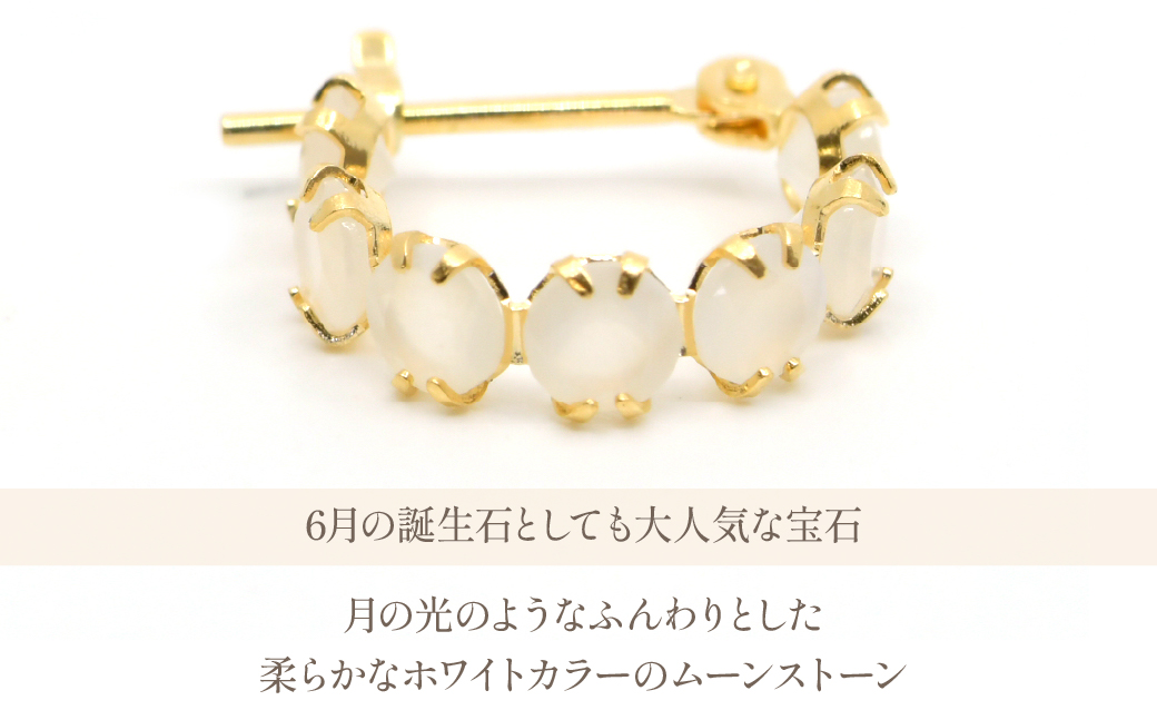 6月の誕生石として人気のムーンストーンを14石使用した18金のフープピアスです。月の光のようなふんわりとした柔らかなホワイトカラーのムーンストーン 和名を月長石と呼ばれ昔から月のパワーを秘めた宝石として大切にされてきました。優しいミルキーなホワイトカラーは身に着けると癒されるような優しい気分にさせてくれる宝石です。上品なカラーのシンプルなピアスは贈り物としても人気のアイテムです。