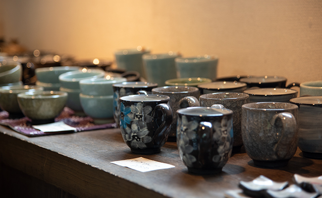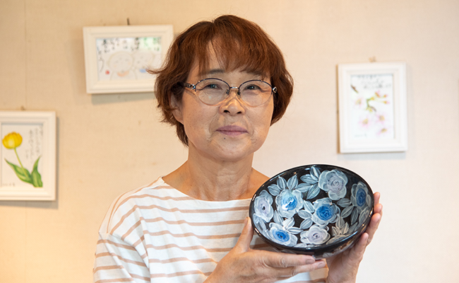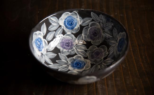 「バラ文鉢」は、素焼き後に色をつけて、上薬を塗って本焼きしています。黒地に白いバラを器の中と鉢の外側に描いています。