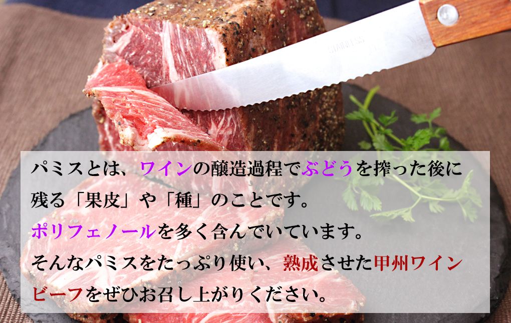 ワインの搾りかす「パミス」をまぶして熟成させた甲州ワインビーフの塊肉が合計1kg(2パック)。(冷凍真空パック)