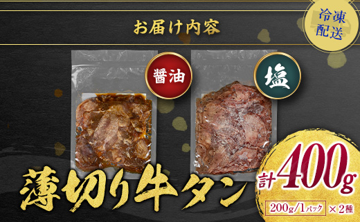 薄切り牛タンを“塩”と“醤油”の2種で楽しめる 食べ比べセット(計400g) を返礼品としてお届けします。