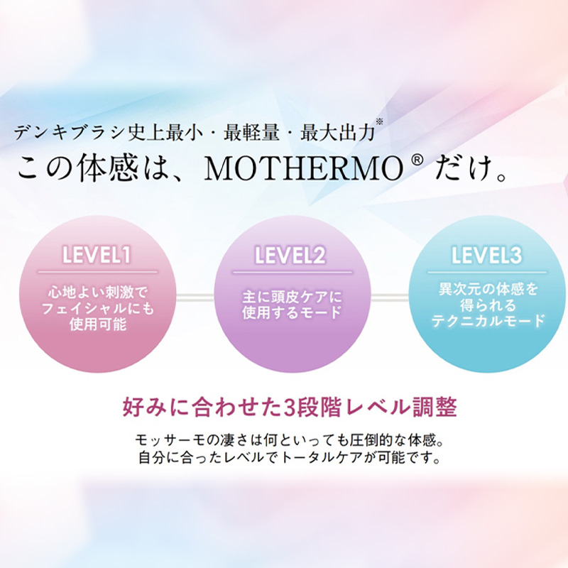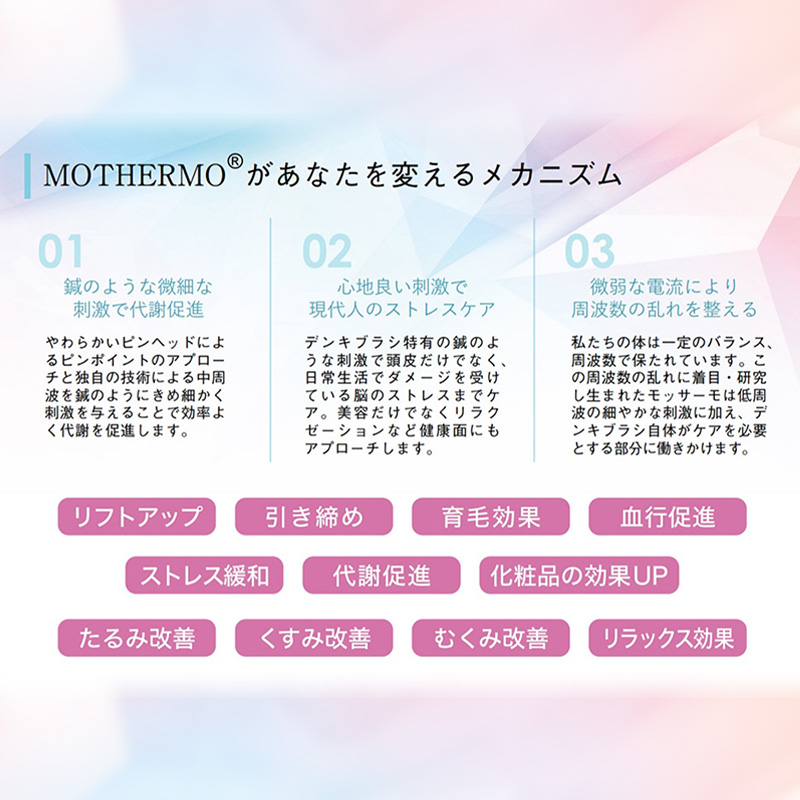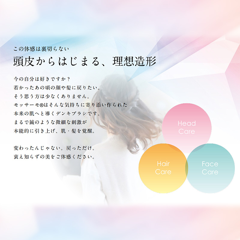 やわらかいピンヘッドによるピンポイントのアプローチで鍼のような微細な刺激で代謝を促進。頭皮だけでなく、日常生活でダメージを受けている脳のストレスまでケア。微弱な電流により体の一定バランス周波数の乱れを整えます。3段階レベルで好みに合わせた調整が可能です。