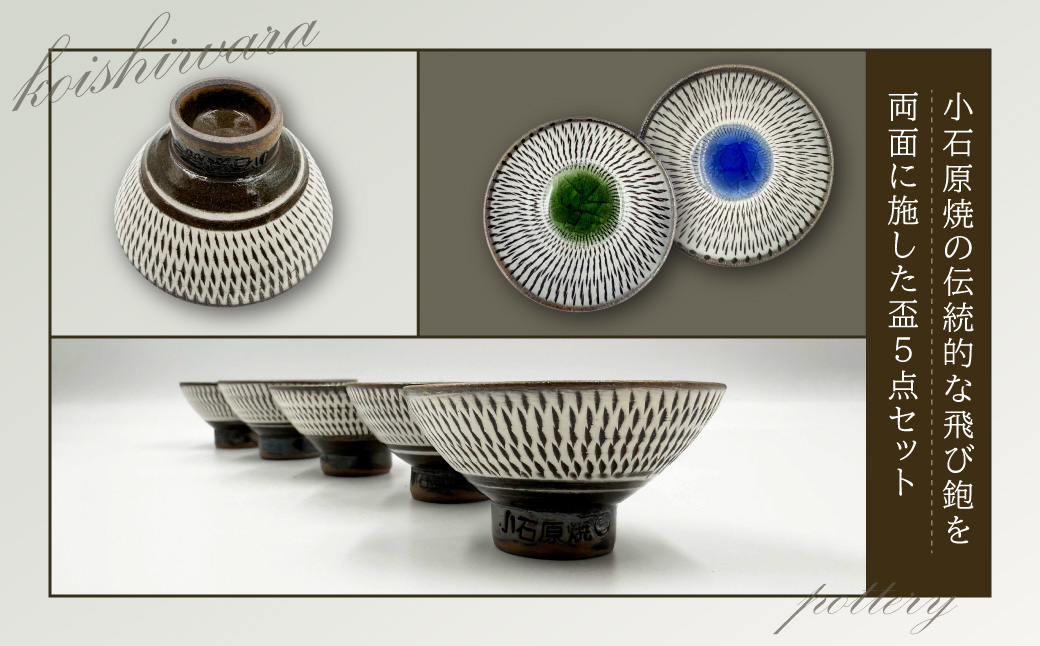 飛び鉋に緑が3つ、飛び鉋に青が2つで合計5点のセットです。