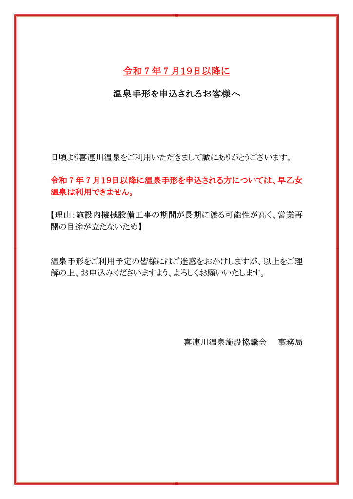 令和7年7月19日以降に温泉手形を申込される方については、早乙女温泉は利用できません。