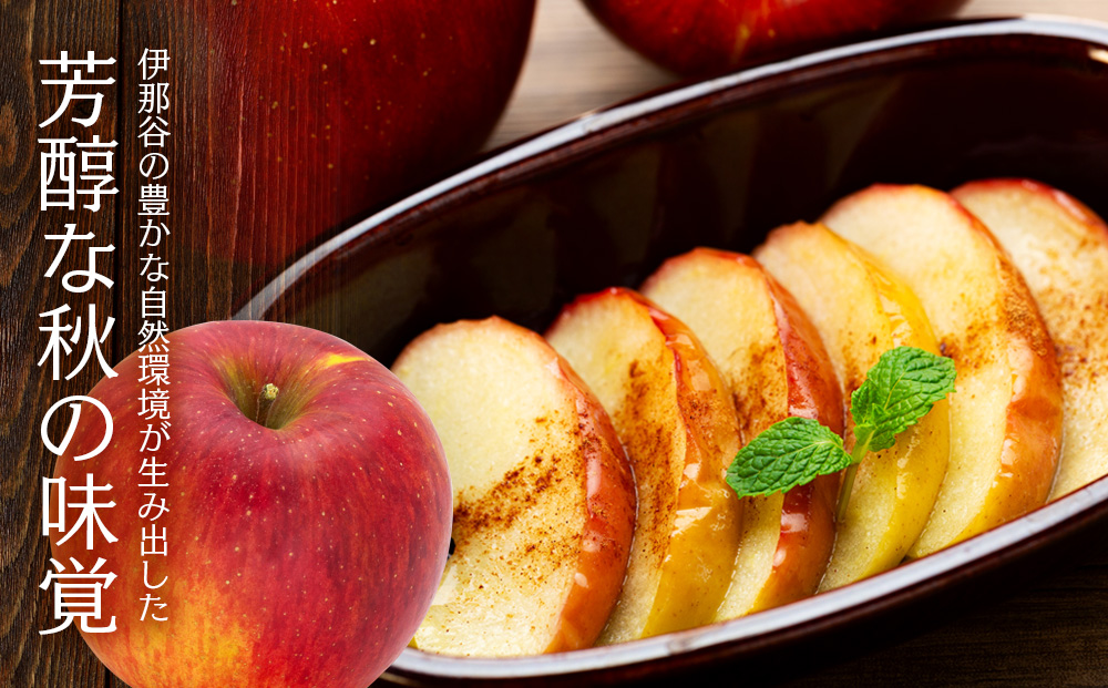 「ふじ」と「つがる」を交配した品種で、鮮やかな赤色と名前の通りほどよい甘味、少ない酸味が特徴です。伊那谷は温暖な気候と豊富な日照量、昼夜の寒暖差など、美味しく育つ条件に優れています。伊那谷の豊かな自然環境が生み出した芳醇な秋の味覚をお楽しみください。