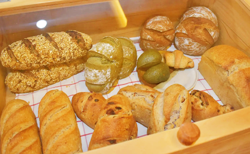バゲット約180g、スピカ、レーズンパン、クロワッサン、お気に入り(くるみレーズン)、くるみパン、ミックスパン、ライ麦パン、山がた食パン、季節のパン(トマト、さつまいも、よもぎなど)の中からおまかせで6~7個