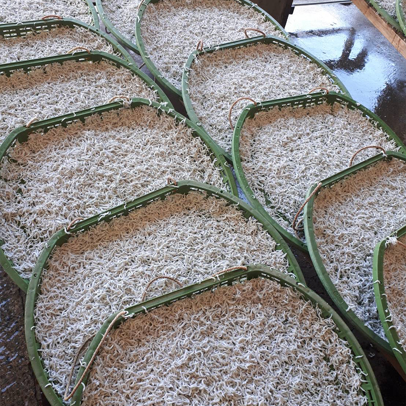干物に使用する魚は紀伊水道を主とし、地元湯浅港ほか有田市や御坊、日高などから買い付けた魚を加工しています。製造作業は全て手作業で行っており、保存料・着色料等は一切使わず塩のみで仕上げた無添加無着色の干物です。丁寧に仕上げられた干物は安心・安全なだけでなく、旨味が凝縮し身もふっくら食べ応え十分です。